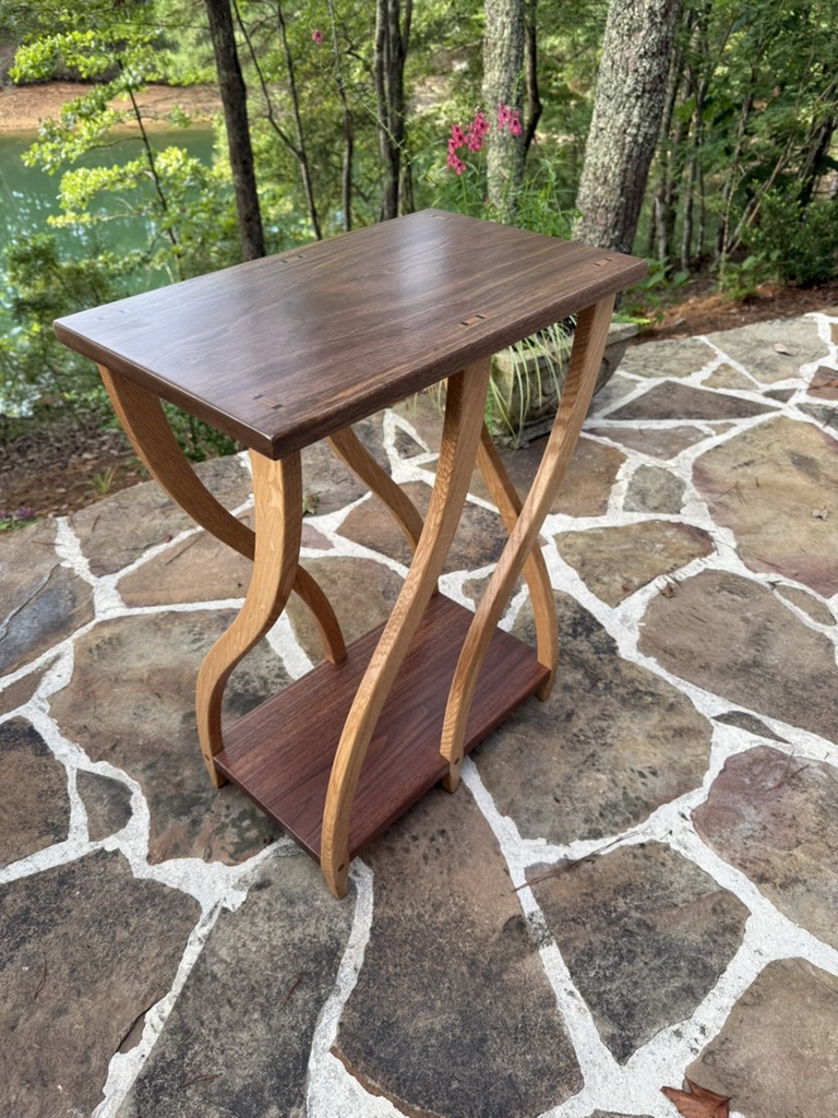 End table, book matched figured Black Walnut, Tiger Striped Oak. Book matched is the descriptive term for the technique of resawing a piece of wood down the middle and opening it like a book to get mirror like images. The two pieces are glued together down the middle. The only screws in this piece are to mount the top, the legs and cross pieces are assembled with through wedge tenon joinery. This is table is my own design and my best work.