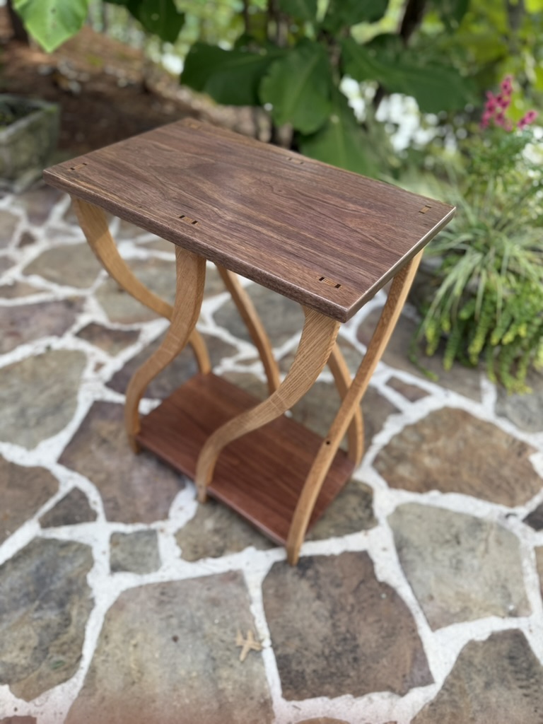 Ellen requested I make an end table for the house. In a wood working magazine, I saw a piece of furniture with wedged through mortise and tenons. Incorporating this style of joinery, I designed these end tables.